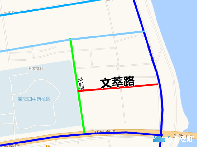 8.文萃路:此路位于庞公街道新襄阳四中东侧,孙家巷村四组和五组之间,长约1100米,宽约30米,呈东西走向。东起滨江大道(孙家巷村五组),西止文冠路(新襄阳四中东侧围墙)。因该路所在庞公片区功能定位是文化教育新区,“文萃”寓意文风兴盛,人才荟萃,与庞公街道文华路、文冠路命名相呼应,故命名为文萃路。
