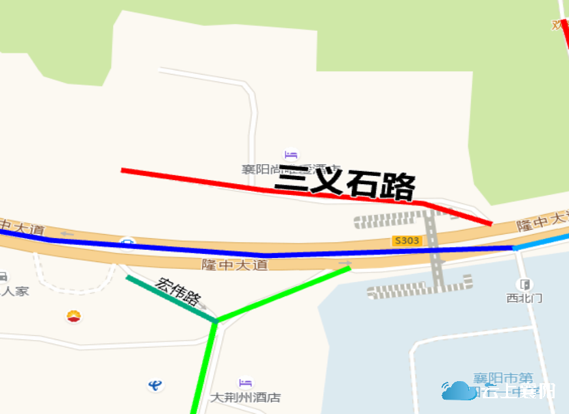 9.三义石路:此路位于隆中街道千山社区,长约107米,宽约4米,呈东西走向,东起隆中大道与檀溪路交界,接万山天桥,西至万山供销社小区门口。三国时,刘备、关羽、张飞三兄弟,从襄阳往西经此处到隆中,请诸葛亮出仕。万山上至今还有张飞井、关羽“刀劈石”、“三义石”,故命名为三义石路。