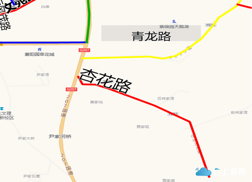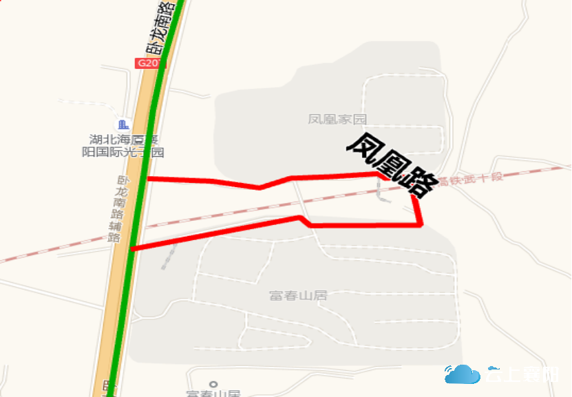 24.凤凰路:此路位于尹集乡凤凰村五组、六组,呈U形走向。长约1200米,宽约7米,起于卧龙南路与汉十铁路高架桥下北侧,途径凤凰家园小区、富春山居小区,止于卧龙南路汉十铁路高架桥下南侧。因此道路是凤凰村村民进出的道路,故命名为凤凰路。