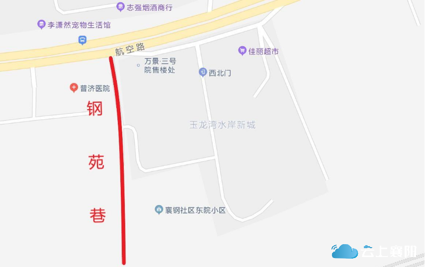 2.钢苑巷:此路位于肖湾街道,长约175米,宽约7米,呈南北走向,北起航空路,南止襄钢社区东院西南角。因该路主要承担襄钢社区东院居民日常出行,附近在住居民主要为钢铁厂职工,故命名为钢苑巷。