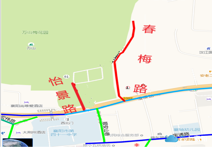 4.春梅路:此路位于檀溪街道万山社区,万山梅园东侧,中石化加油站西侧,长约400米,宽约5米,呈南北走向,南起檀溪路,北止万山陶瓷厂家属院围墙。因该路位于梅园公园的外侧,梅花别名为春梅,故命名为春梅路。