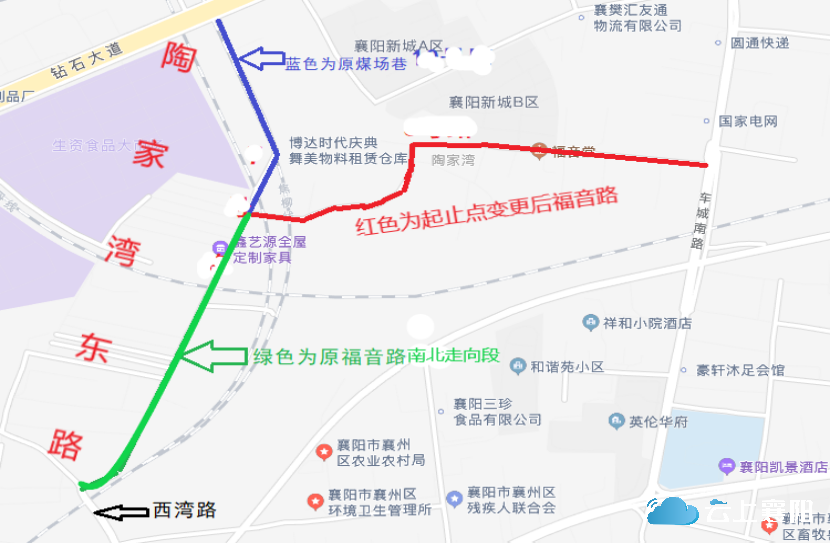 5.陶家湾东路:该路原名为煤场巷,因道路改扩建,为优化道路起止点,方便群众出行,拟将福音路南北走向段和煤场巷合并,合并后长 1200米,宽12米,呈南北走向,北起钻石大道,南止西湾路。因该路与陶家湾路平行,且位于陶家湾路的东面,故更名为陶家湾东路。