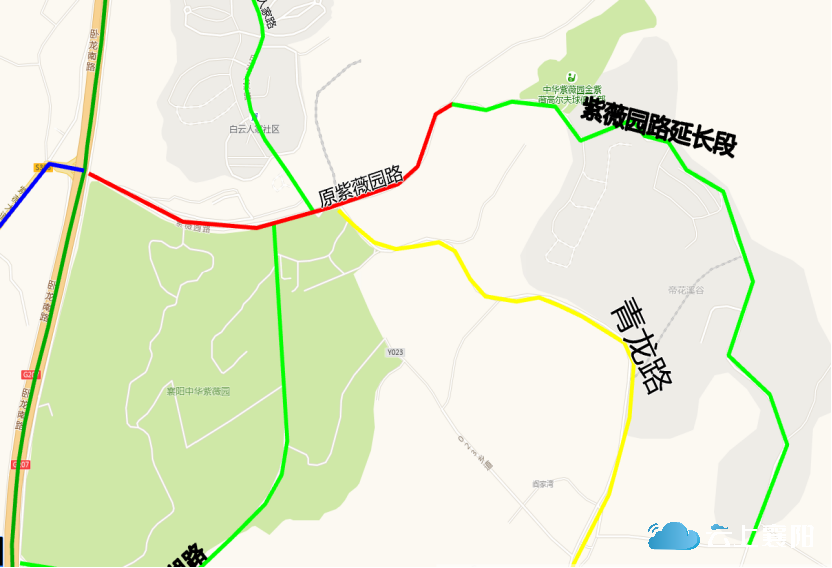 36.紫薇园路:该路位于尹集乡青龙村、凤凰村交界处,原起止点为西起卧龙南路尹集东街路口,东止岘山绿道交汇处,长约2000米,宽约12米。根据城市规划发展情况,现起止点变更为西起卧龙南路尹集东街路口,途径世风国茂后向南折至帝花溪谷、恒大御景等小区,止于恒大御景项目二期大门口,变更后全长约3100米,宽约12米。