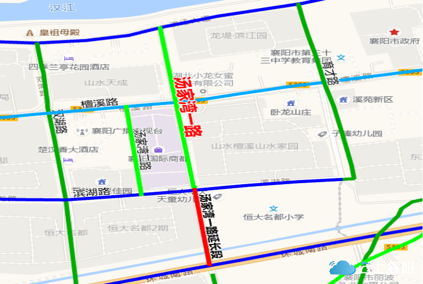 33.汤家湾一路:该路位于檀溪街道,原起止点为南起滨湖路(山水家园与国际商都处)北止滨江大道(龙堤滨江园西侧),长约660米,宽约35米。因道路改扩建,现将汤家湾一路起止点变更为南起恒大二期东边襄水处,北止滨江大道(龙堤滨江园西侧),变更后呈南北走向,长约900米、宽约35米。