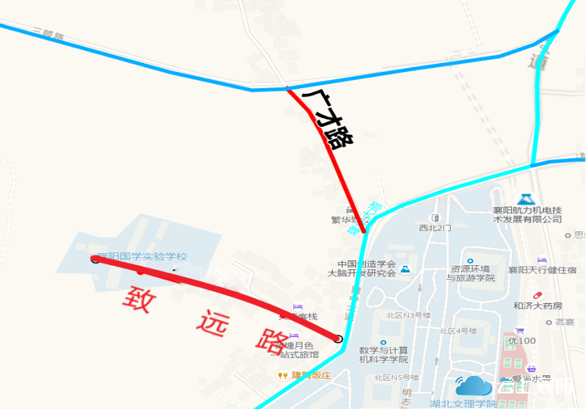 11.广才路:此路位于隆中街道隆中社区,长约400米,宽约3.5米,呈南北走向,南起湖北文理学院大门口对面西北侧(长江超市),北至三顾路。“广才”出自诸葛亮《诫子书》:“非学无以广才,非志无以成学”,意为扩展才能。因此路起点为湖北文理学院,寓意广大学子,学以成才,故命名为广才路。