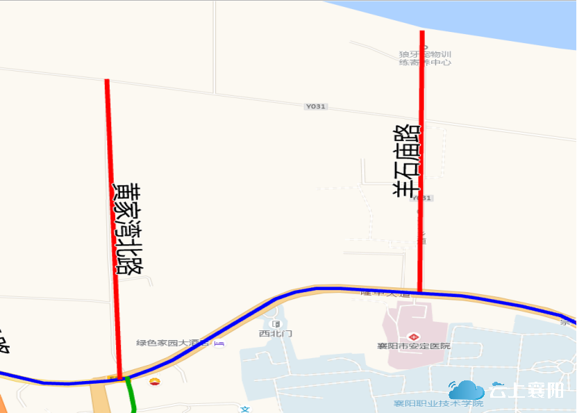 13.羊石庙路:此路位于隆中街道黄家湾社区,全长约900米,宽约4.5米,呈南北走向,南起隆中大道安定医院对面,北至汉江边。因此路段起点历史上有羊石庙,故命名为羊石庙路。