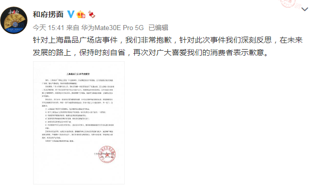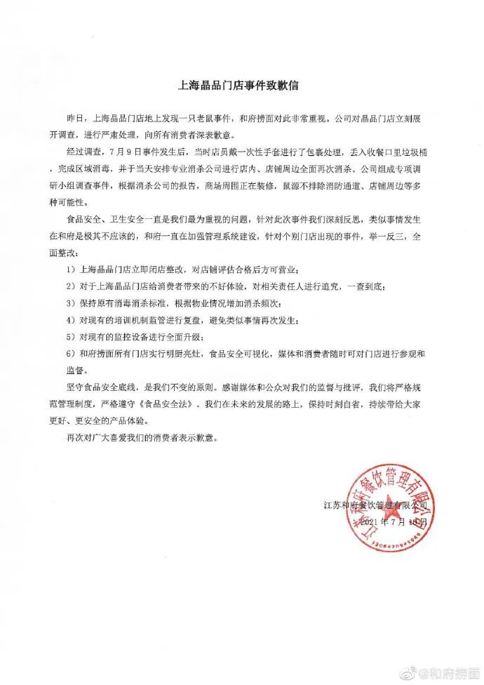 针对上海晶品广场店出现死老鼠事件,和府捞面10日发布致歉信。引发大量网友关注,冲上热搜第一。