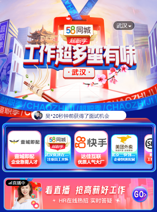 本届58同城“超职季”以“工作超多超有戏”为主题,设置了名企直播、超多职位、企业专区、城市专区等众多板块,云集全国各地超500万家企业,汇聚超多匹配度高、入职率高的“双高”岗位,向用户提供多元化、趣味化、便捷化的求职渠道。随着疫后重振步伐加快,武汉各行各业对人才的需求趋旺,58同城希望通过城市专区加速武汉企业引贤纳才,通过优化人才结构驱动城市发展。