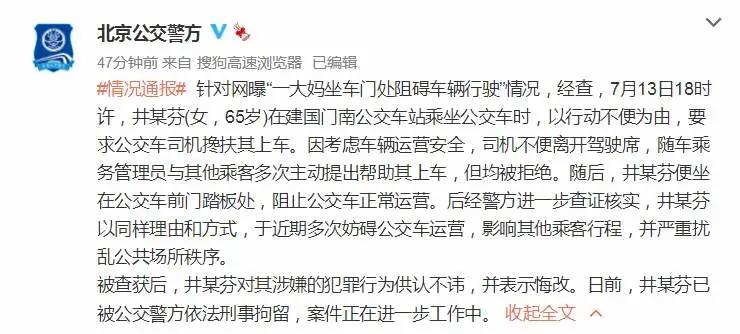 7月18日,北京公交警方官微通报,针对网曝“一大妈坐车门处阻碍车辆行驶”情况,经查,7月13日18时许,井某芬(女,65岁)在建国门南公交车站乘坐公交车时,以行动不便为由,要求公交车司机搀扶其上车。