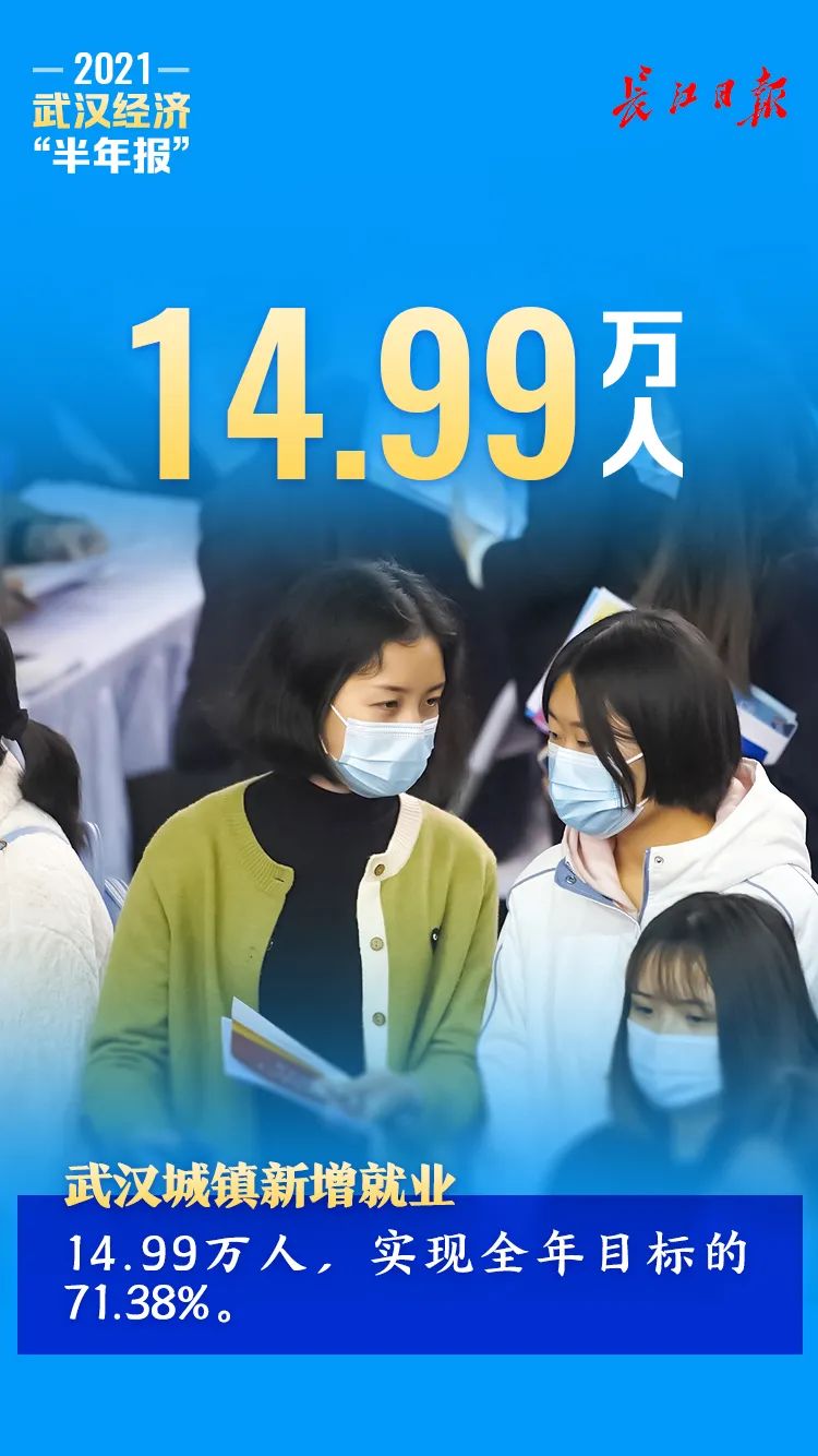 上半年,武汉市城镇新增就业14.99万人,实现全年目标的71.38%。