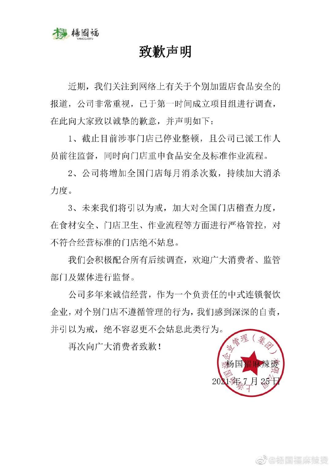 杨国福麻辣烫随后道歉称,涉事门店已经停业整顿,已派人前往监督。公司将加大对全国门店稽查力度,对不符合经营标准的门店绝不姑息。