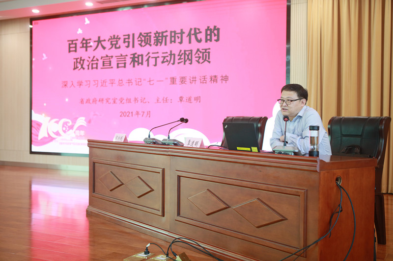 省委宣讲团成员、省政府研究室主任覃道明以《百年大党引领新时代的政治宣言和行动指南》为题作专题辅导。辅导报告从深刻把握讲话的精神内涵、深刻把握党的百年奋斗主题和深刻把握第二个百年奋斗目标的根本要求等三方面,系统阐释了习近平总书记“七一”重要讲话的重大意义、精神内涵、核心要义和根本要求;结合学习贯彻省委十一届九次全会精神,立足湖北“建成支点、走在前列、谱写新篇”目标定位,深刻阐明了“什么是支点、怎样建成支点”这一事关湖北长远发展的重大战略问题。