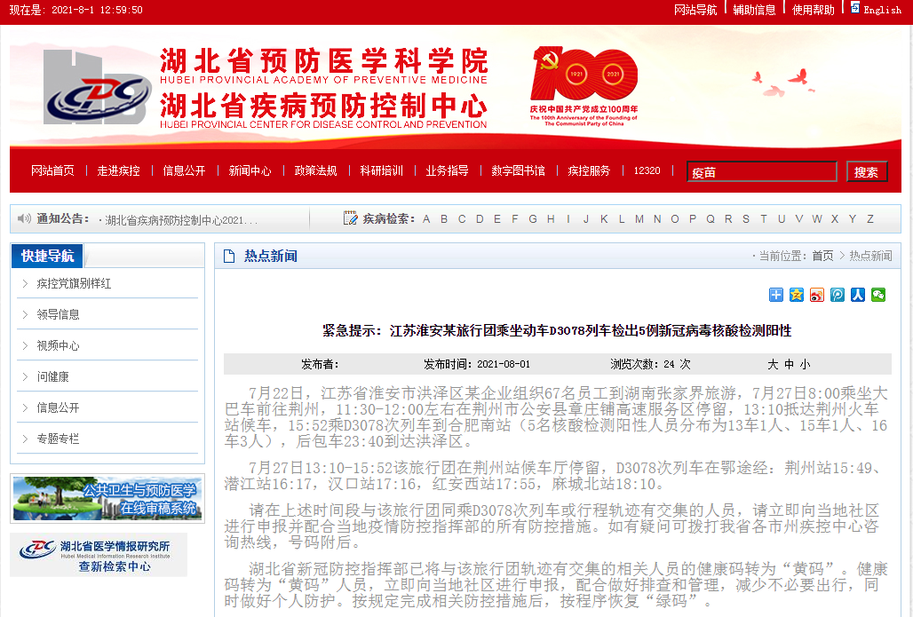 8月1日,湖北省疾控中心发布紧急提示如下: