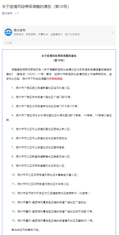 根据国务院联防联控机制《关于调整新冠肺炎疫情分区分级标准实施精准管控措施的通知》(国电发〔2020〕11号)要求,经扬州市新冠肺炎疫情防控工作指挥部研究,自发布之日起,扬州市下列地区调整为中风险地区: