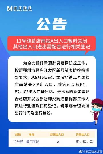8月5日晚,武汉地铁集团发出公告:8月6日起,轨道交通11号线葛店南站部分出入口关闭,其他出入口进出需配合进行相关登记。