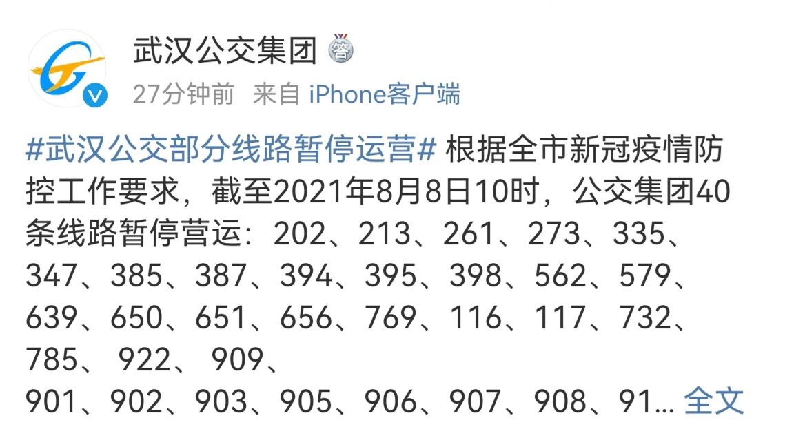 8月8日上午,武汉公交集团微博发布最新公交运营情况称:根据全市新冠疫情防控工作要求,截至8月8日10时,公交集团40条线路暂停营运,具体恢复时间另行公告▼