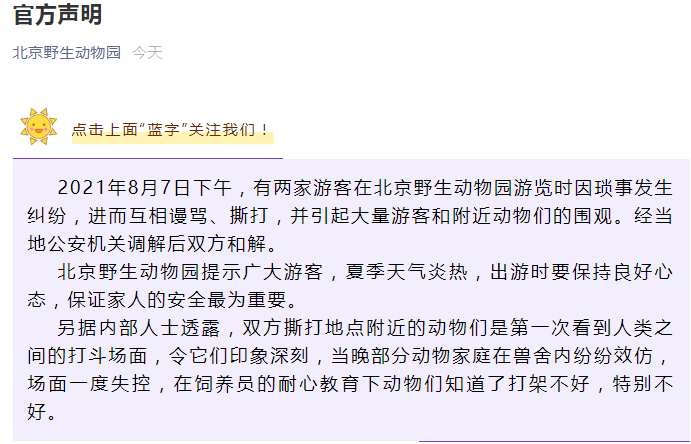 声明称:2021年8月7日下午,有两家游客在北京野生动物园游览时因琐事发生纠纷,进而互相谩骂、厮打,并引起大量游客和附近动物们的围观。经当地公安机关调解后双方和解。