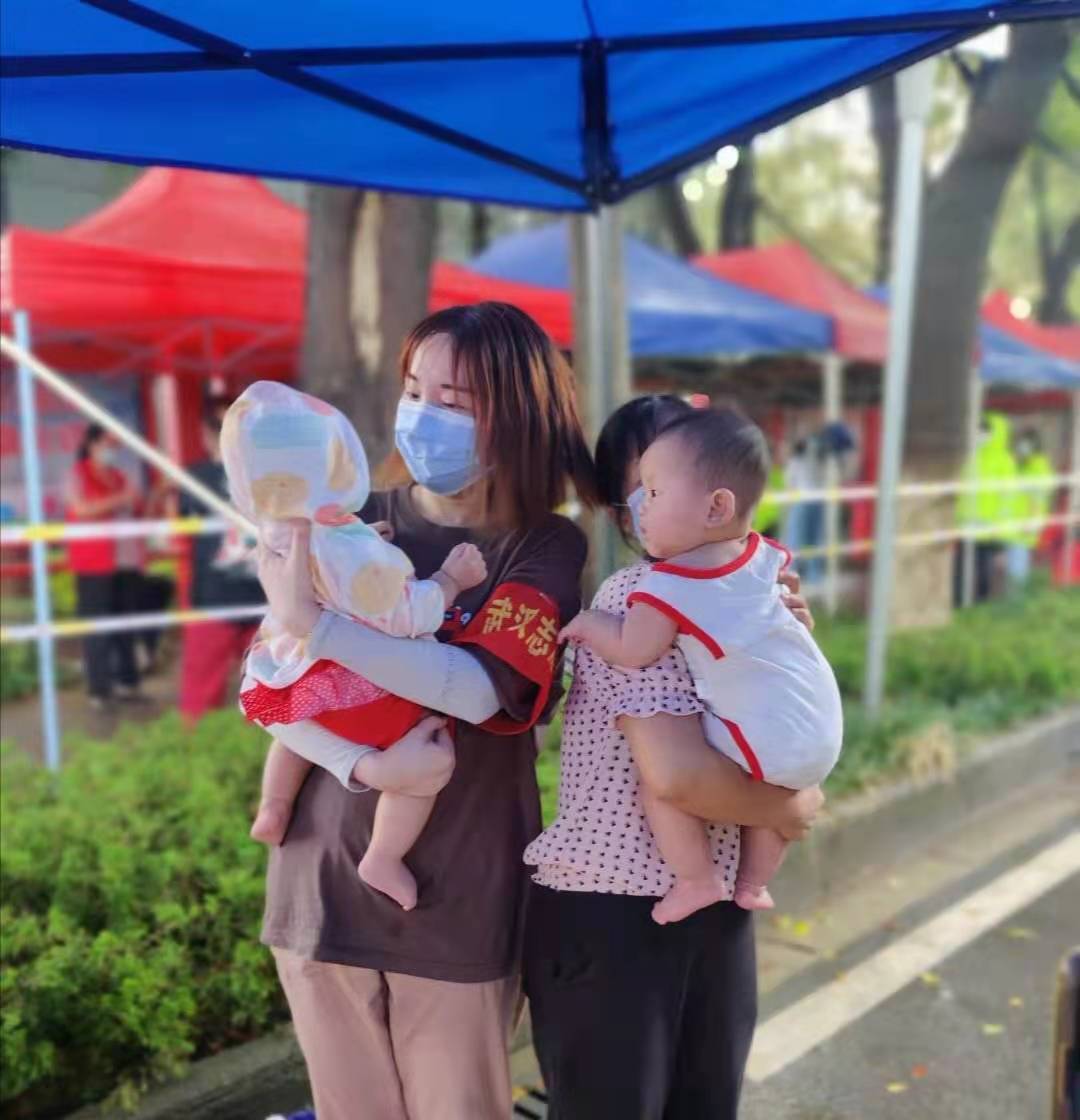 8月10日下午,城管队员刘莹在支援辖区核酸筛查工作现场,发现一对推着老人并手抱两位孩子的夫妻在焦灼的排队等候,婴儿哭闹不停,随即上前询问得知因老人腿脚不便,孩子太小,夫妻俩为随后的检查担忧不知所措。刘莹逗着婴儿拍着这位母亲的肩说“不用担心,要是放心我们的话,孩子就交给我们照顾”。