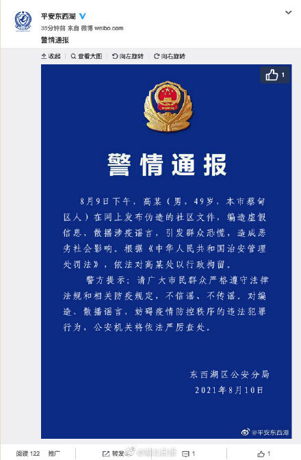 8月10日晚,武汉市公安局东西湖区分局发布警情通报,高某因在网上发布伪造的社区文件,编造虚假信息,散播涉疫谣言,被公安机关依法处以行政拘留。