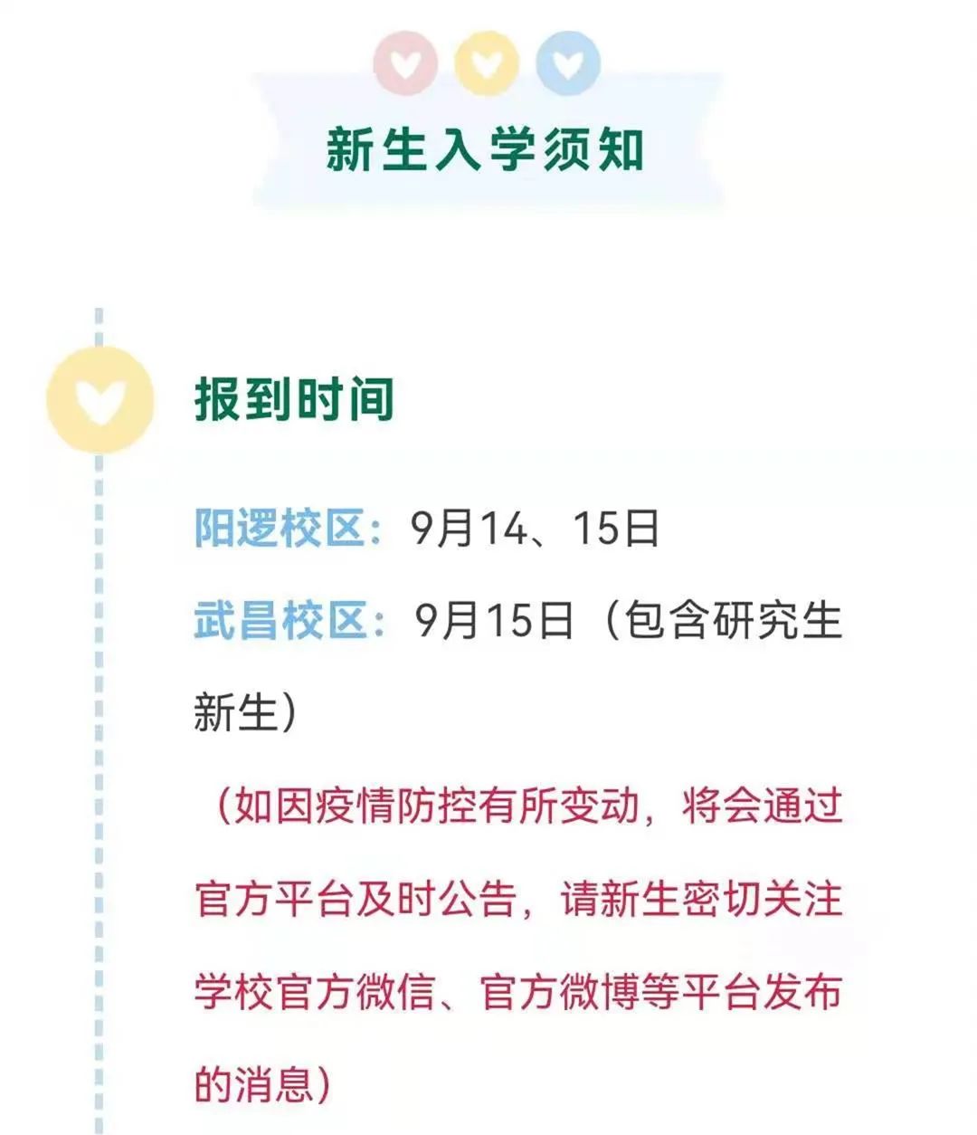 学生线下报到时间,阳逻校区为9月14、15日;武昌校区为9月15日(包含研究生新生)。学校表示如因疫情防控有所变动,将会通过官方平台及时公告。该校也要求新生需在来校报到前14天,每天登录湖北大学微门户进行健康填报,来自中高风险地区的学生报到时须向学校出示一周内的核酸检测报告。