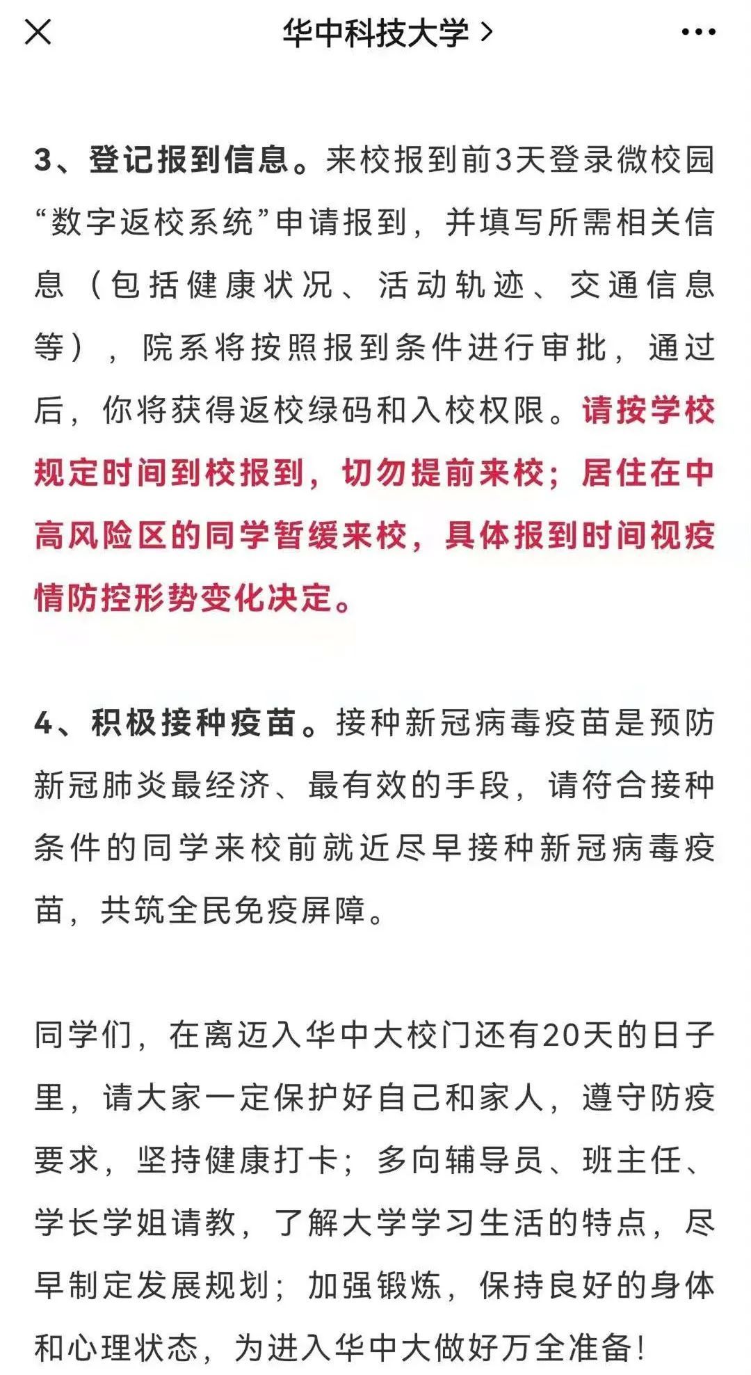 8月11日,华中科技大学发布消息,8月12日起,该校☞数字迎新平台准时开通,所有本科新生需在8月15日之前,在平台上完成自助报到手续。该校同时要求,居住在中高风险区的同学暂缓来校,具体报到时间视疫情防控形势变化决定。