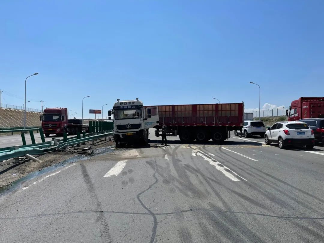 近日,新疆乌拉泊交警巡逻至连霍高速公路时,发现一辆半挂牵引货车横停在路上。