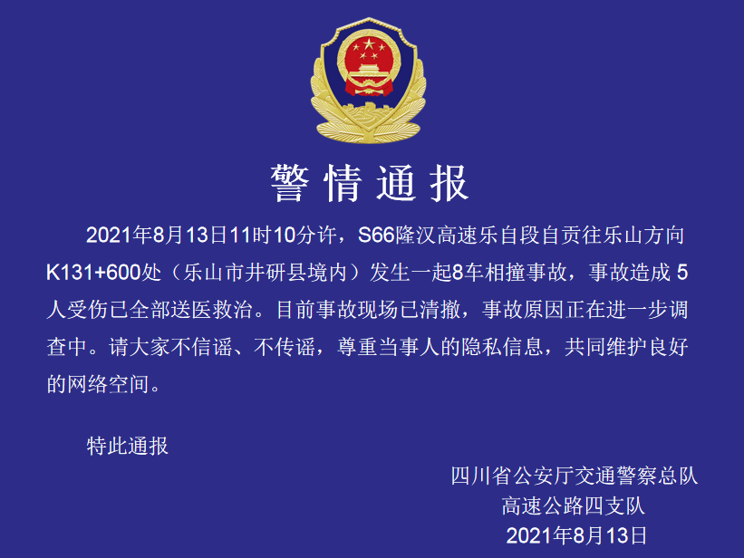 记者从四川省公安厅交通警察总队高速公路四支队获悉,8月13日上午11时许,S66隆汉高速乐自段自贡往乐山方向K131+600处(乐山市井研县境内)发生一起8车相撞事故,事故造成5人受伤已全部送医救治。
