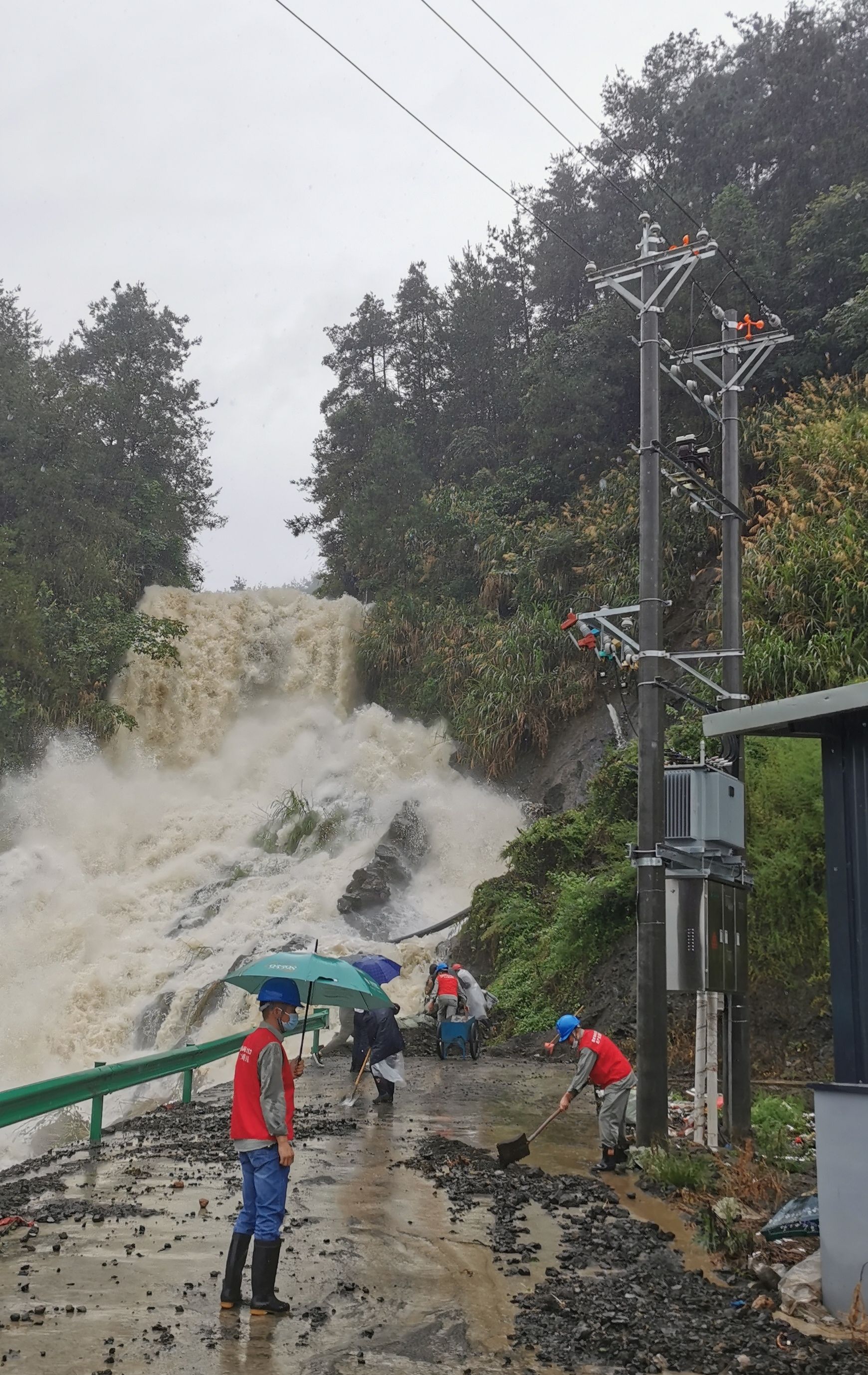 连日来,由于遭受持续强降雨袭击,竹溪县境内河水暴涨。13日凌晨,位于中峰镇的大沟水库超警戒水位,泄洪口水量居高不下,极大威胁到水库下游的群众生命财产安全。由于洪水长时间的浸泡、冲刷,地处水库泄洪道一侧的河堤露出了3米多宽的豁口,大水冲毁路边交通护栏,漫灌到乡村公路,直逼甘家岭3号供电台区。