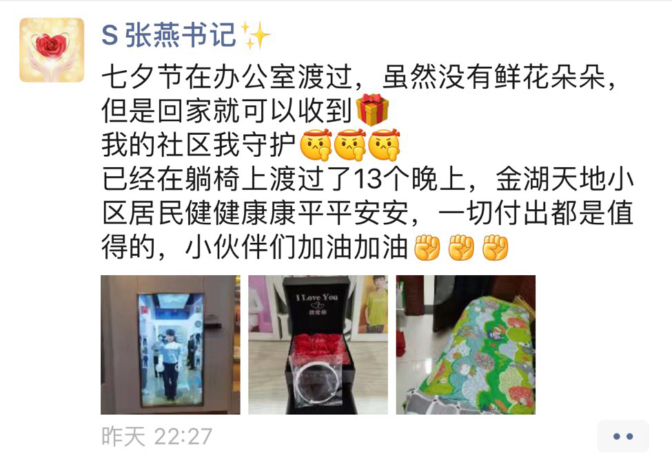 昨天,刚好是“七夕节”, 已经十几天没回家的她,心里十分想念丈夫、儿子,还有父母。张燕发了一个朋友圈,写道:到“七夕节在办公室度过,虽然没有鲜花朵朵,但是回家就能收到礼物,已经在躺椅上度过了13个晚上,金湖天地小区居民健康平安,一切付出都是值得的”。