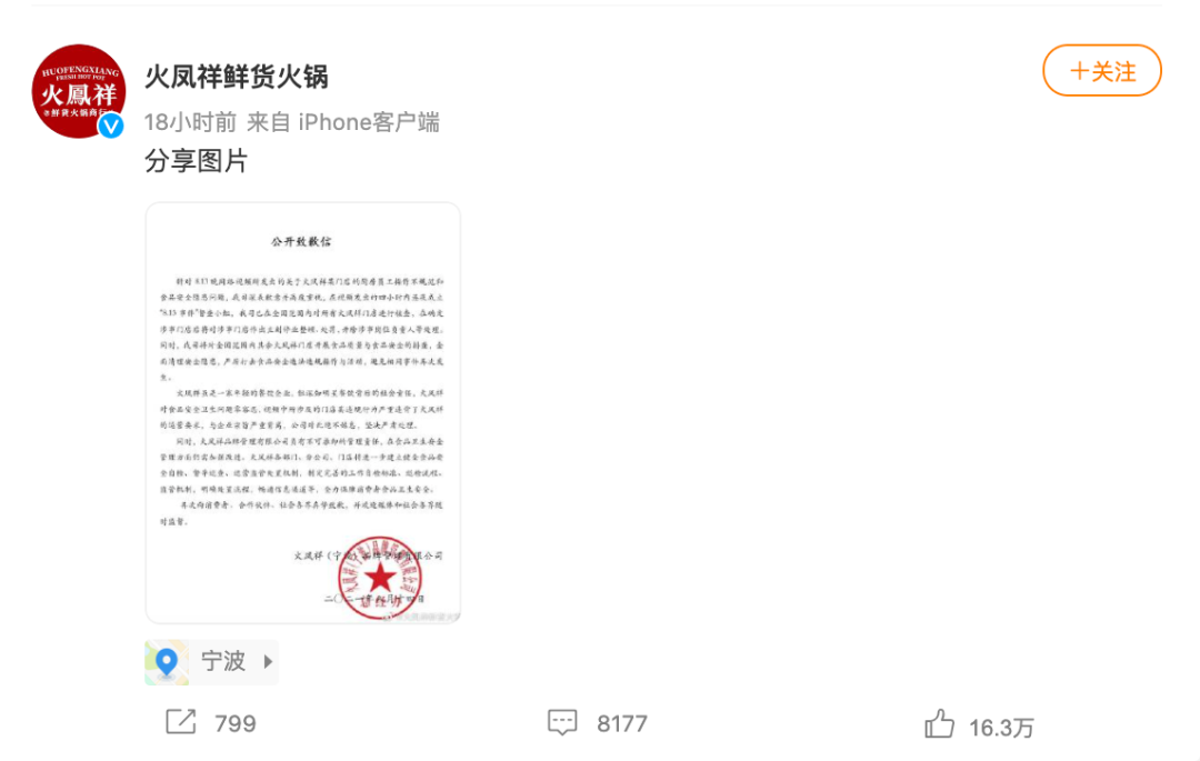 日前,据钱江晚报报道称,有微博爆料在调查郑恺投资的连锁火锅店火凤祥时,发现其售卖变质食材、生菜回收重复使用、卤汤发酸,让人大跌眼镜。8月14日深夜,郑恺的连锁火锅店@火凤祥鲜货火锅 发布公开致歉信,就此致歉。