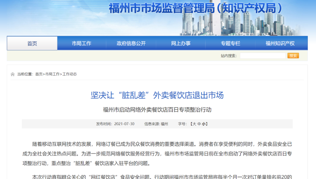今年7月30日,福州市市场监督管理局发布公告称,为进一步规范网络餐饮服务经营行为,福州市市场监管局在全市启动了网络外卖餐饮店百日专项整治行动。