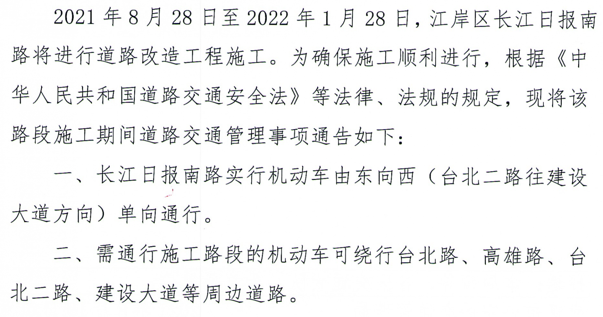 关于长江日报南路改造工程 施工期间交通管理的通告{武公交规〔 2021〕42号}