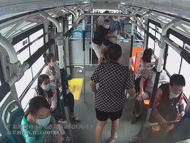 据公交车上监控视频显示:当天下午14点22分,一辆自编号为2342的527路公交从金银潭地铁站始发,开往汉口沿江大道江滩足球场,行驶至姑嫂树路长港路路口附近时,车厢中部一名30多岁男子突发急病,口吐白沫、浑身抽搐,身体还慢慢向前栽倒......紧急关头。邻座一位黑衣男乘客赶紧起身,一把截住对方,防止头部撞伤。几乎同时,前排座位上一名身穿蓝色衬衣的男乘客也快速转身,绕到男子身后,帮忙扶稳身体、掐其人中、下拉口罩、尽量躺平。另外一名花衣女乘客一边呼救一边上前,拉开车窗通风。公交527路司机余力闻讯,也车辆减速,关切询问。“前面就是医院,赶紧送过去......”不知是谁提醒了一句,一车乘客都表示赞同。