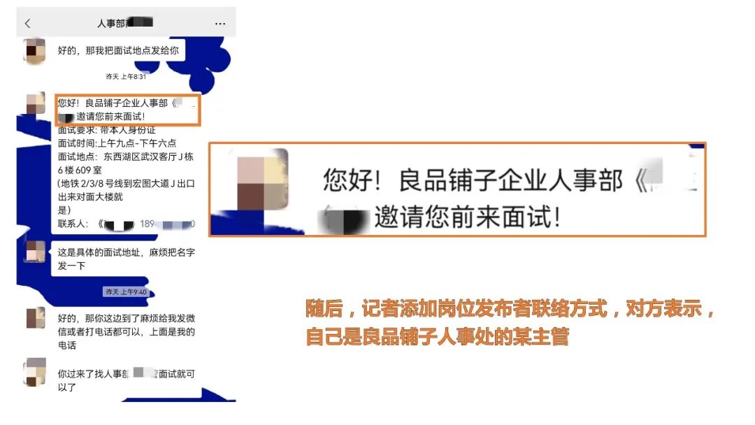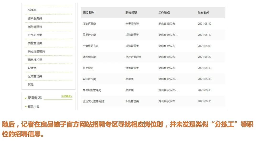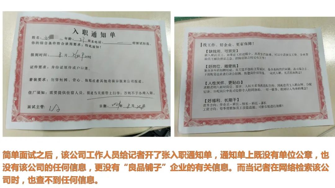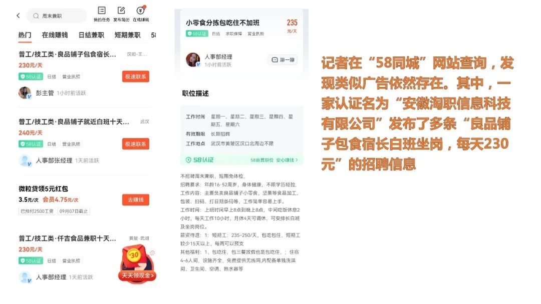 记者上“**同城”网站查询,发现类似广告依然存在。其中,一家认证名为“安徽淘职信息科技有限公司”发布了多条“*品铺子包食宿长白班坐岗,每天230元”的招聘信息,对方称自己是*品铺子人事处,而实际上则是一家名为“HR名企·直招”的人力资源公司。