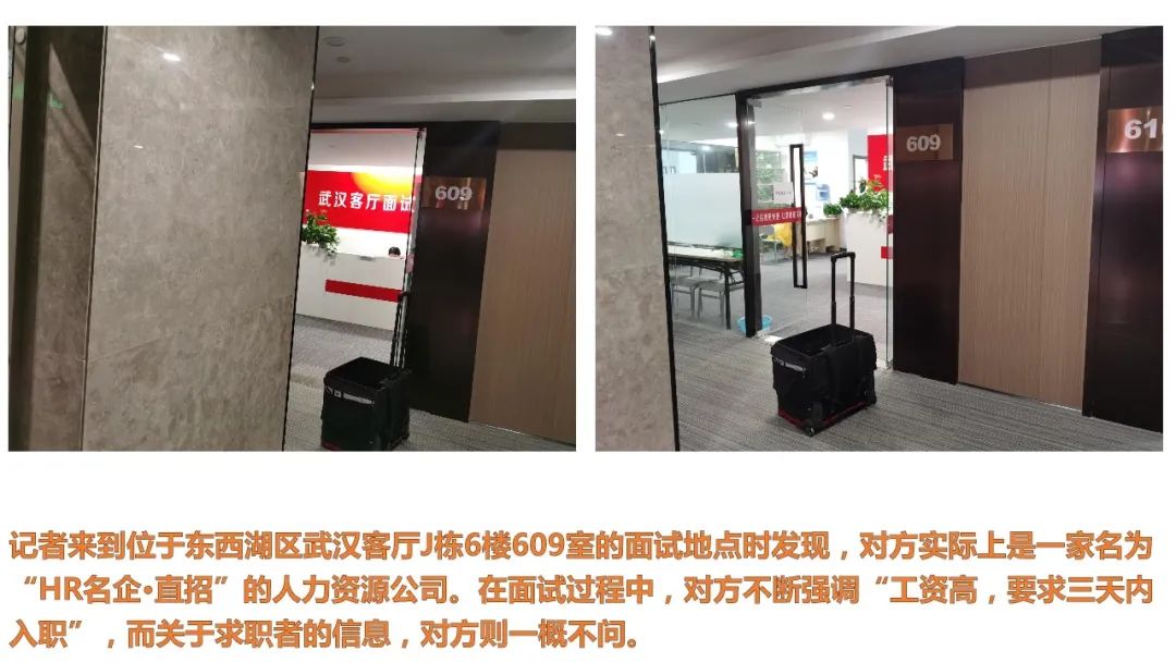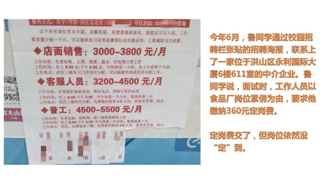 今年6月,大二学生小鲁通过校园招聘栏张贴的招聘海报,联系上了一家位于洪山区永利国际大厦6楼611室的中介企业。面试时,工作人员以食品厂岗位紧俏为由,要求他缴纳360元定岗费,但岗位依然没“定”到。小鲁赶到面试地点要求退钱,却发现这家公司已经人去楼空。