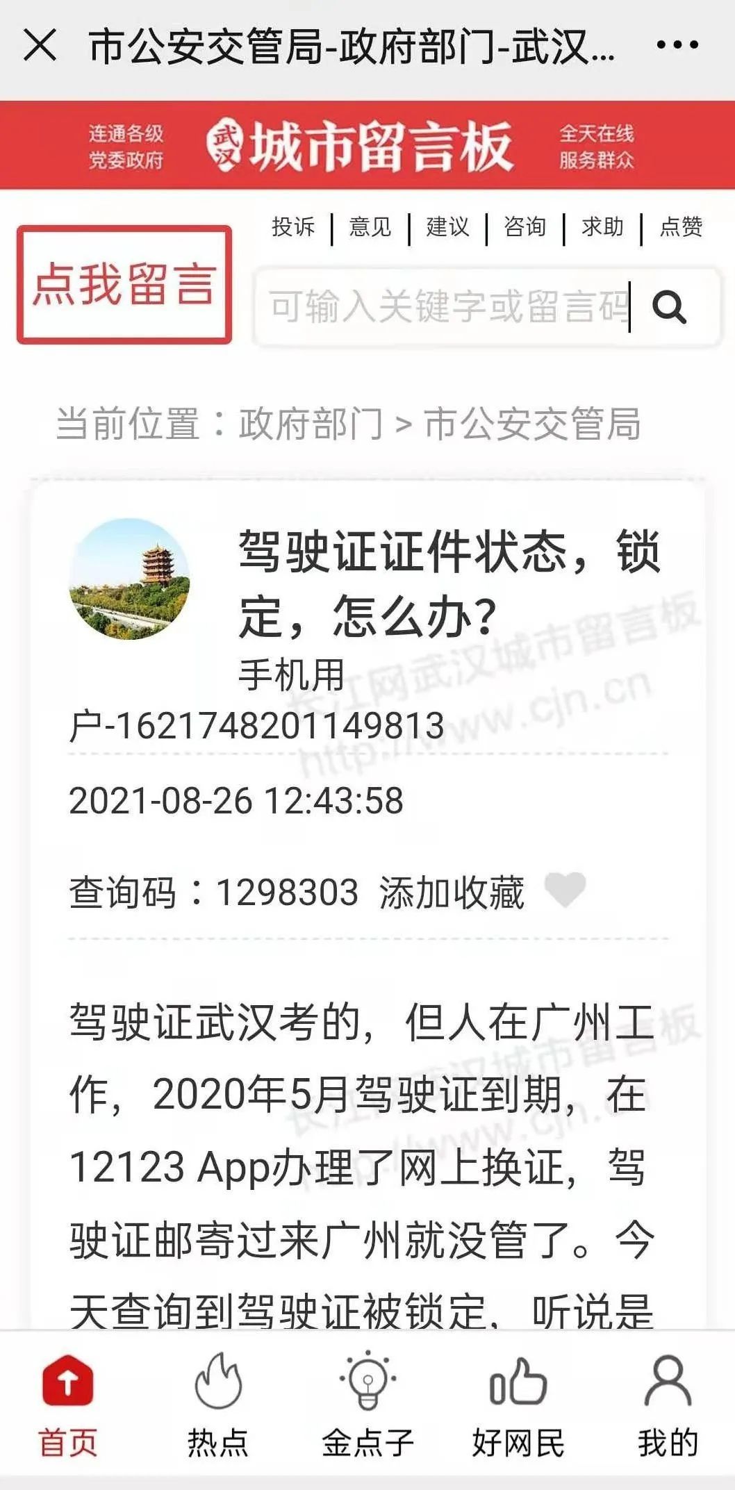 近日,一位远在广州的网友在武汉城市留言板反映,驾驶证被锁定后该怎么处理?需要回武汉办理吗?对此,武汉市公安交管局回复称,当事人驾驶证因“容缺办理”未补交身体条件证明被系统锁定,可在异地选择驾驶人体检医院办理补交驾驶人体检业务。