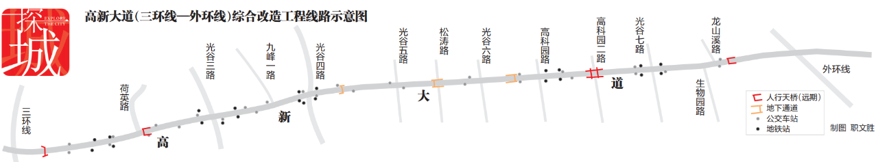 高新大道(三环线—外环线)综合改造工程全长10.7公里,将高新大道原来的双向10车道(主道6车道、辅道4车道)拓宽至双向14车道(主道8车道、辅道6车道),红线宽70米。