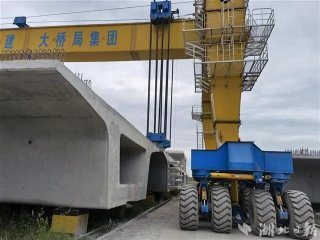 40公里外的沙洋县十里铺,是中铁建大桥局承建的标段。占地156亩的梁场上,摆放着10多个“巨无霸”——每榀长32.6米、宽12.6米、重达800多吨的“T”形箱梁,提梁机、架桥机、运梁车来回穿梭。