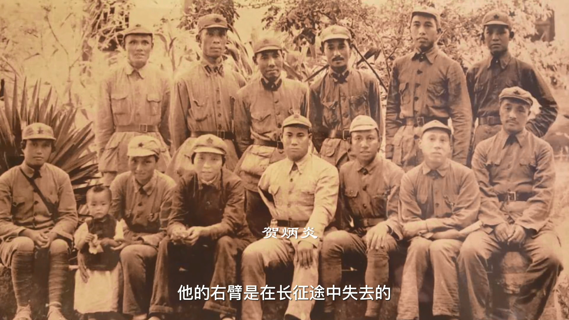 贺炳炎的右臂是在1935年长征途中失去的,他在瓦屋塘战斗中,右臂被威力巨大的达姆弹击中,骨头被炸得粉碎,只有锯掉胳膊才能保住性命。当时医疗器材匮乏、药材短缺,只能用锯木头的锯子锯右臂。贺炳炎大汗淋漓、面色苍白,医生的手在发抖,怎么也不敢使劲,贺炳炎鼓励医生说:“我自己都不怕,你还怕什么?来吧!”手术前后共用了2小时16分钟,贺炳炎嘴里的毛巾被咬得稀烂,失去右臂的贺炳炎,被称为“独臂将军”。不论时代怎么发展,我们都需要发扬这种硬骨头精神,做到困难面前不低头、泰山压顶不弯腰。