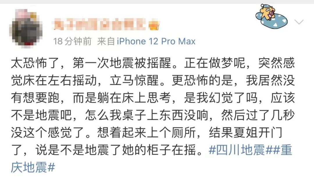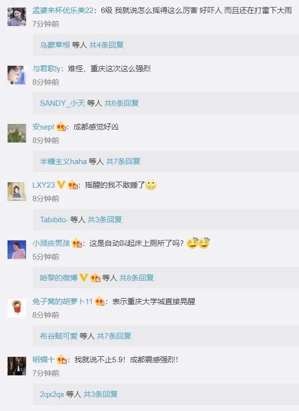 一名网友说,自己在重庆,地震了几秒,床摇了几秒,感觉心头一阵一阵的害怕。