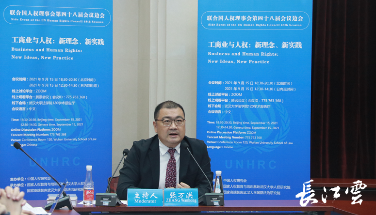 2021年9月15日,由中国人权研究会主办,武汉大学人权研究院、国家高端智库武汉大学国际法治研究院联合承办的“工商业与人权:新理念、新实践”国际视频研讨会成功举办。本次活动属于联合国人权理事会第48届会议云上边会之一,线下会场设在在武汉大学法学院。来自国内外高校、行业协会、基金会的专家学者和业内人士共近200人通过线上或线下方式参与了本次会议。