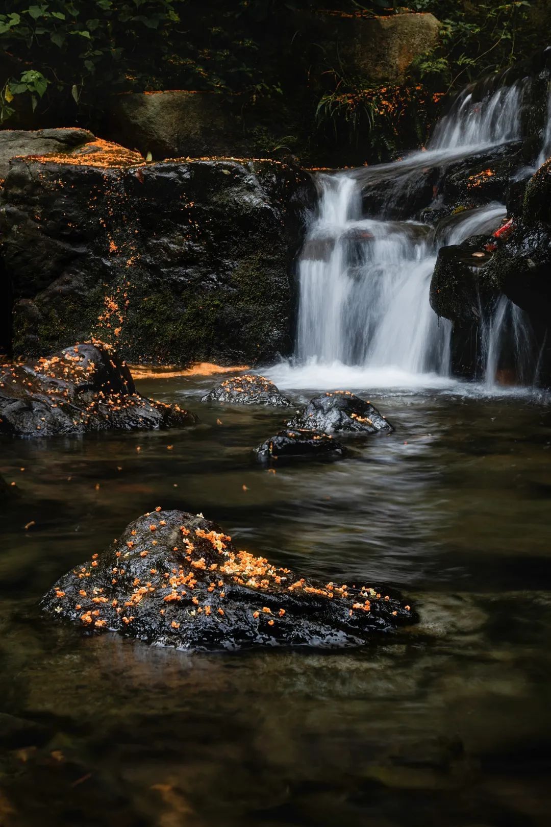 (出自宋朝黄庭坚《答许觉之惠桂花椰子茶盂二首》 ;下图中为杭州净慈寺,桂花落雨,狸猫闲逸,摄影师@喵呜不停)