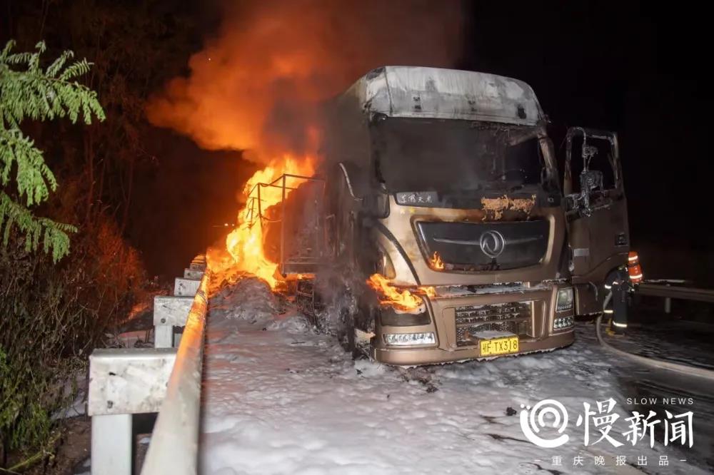 9月20日23时41分,涪陵区消防救援支队指挥中心接群众报警称,一辆货车在石渝高速涪陵东服务区附近起火,车内满载快递包裹,车头和货箱都已起火,现场火势较猛。