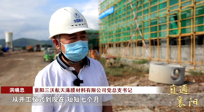襄阳三沃航天薄膜材料有限公司党总支书记 洪晓忠:“提供了一站式服务,从开工仪式到现在 短短七个月,我们项目100亩地上的主要建筑都已拔地而起,(现在)综合库房已经完成了建设的封顶,现在正在进行内部的装修 还有一些粉刷工作,预计这个月底可以全面建成投入使用。”