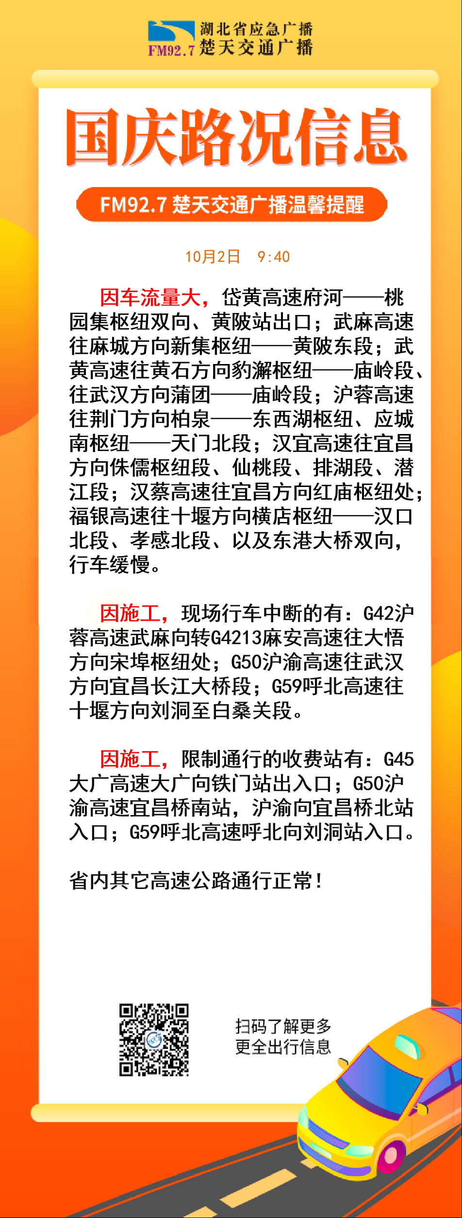 因车流量偏大,现场行车缓慢的有:G42沪蓉高速往荆门方向东西湖枢纽至汉川段;G50沪渝高速往荆州、宜昌方向侏儒枢纽段;G70福银高速往黄梅方向小池至龙感湖段;S1岱黄高速双向府河至桃园集枢纽段;S15汉蔡高速往宜昌方向侏儒枢纽段。