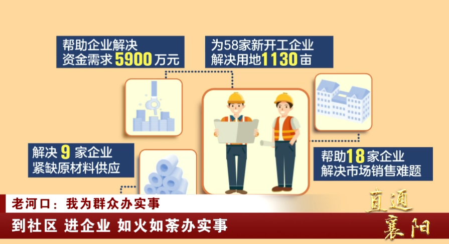 今年,老河口市开展“百名干部进百企”活动以来,共为58家新开工企业解决用地1130亩、帮助企业解决资金需求5900万元、解决9家企业紧缺原材料供应、帮助18家企业解决市场销售难题。
