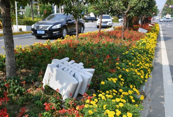 古田三路往沿河大道方向隔离带花坛上,一排“廉”字很醒目