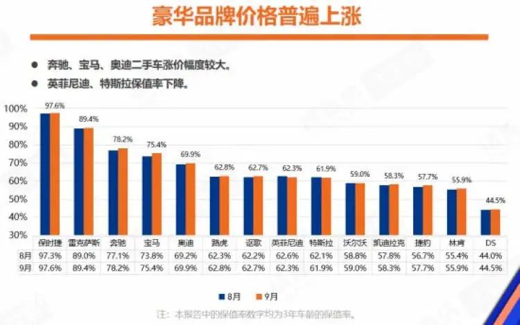 在二手车保值率方面,9月小型车价格涨幅高于整体,“产品供应不足”的情况已经比较严重,终端买家对于车辆的尺寸、性能等要求有所放宽,出行的刚需重新成为购买二手车的主要动因。