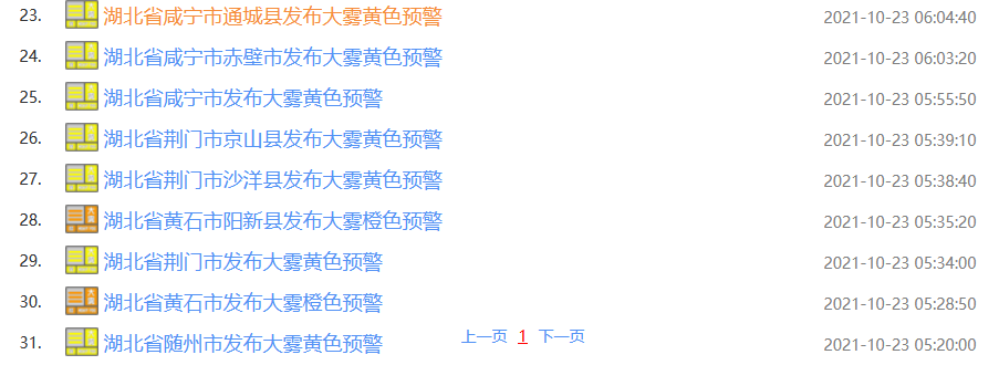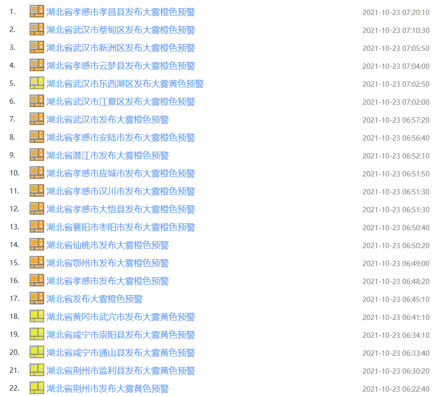 武汉中心气象台2021年10月23日06时43分发布大雾橙色预警信号:目前,除十堰、神农架、恩施地区外,湖北省部分地区已出现能见度小于200米,局部小于100米的雾,预计今天上午仍将持续,请注意防范。