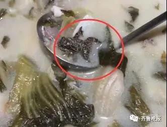 江苏苏州的宋女士在相城区一家酸菜鱼餐厅就餐,点了一盆酸菜鱼,吃到一半竟“吃出”一只完整的黑乎乎的癞蛤蟆,约硬币大小,十分吓人。